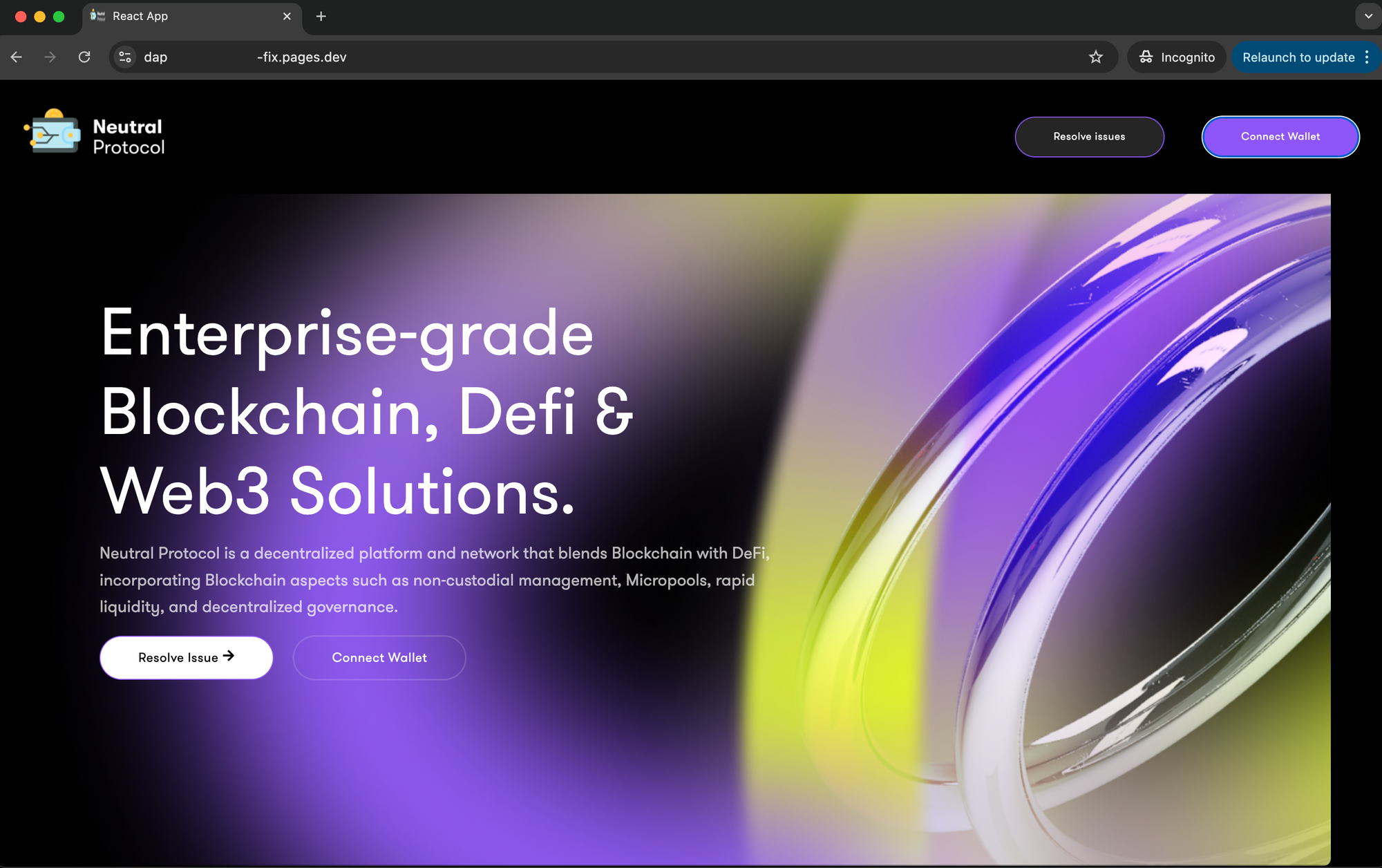 All right, "React App" by "Neutral Protocol", what would happen if I hit "Resolve issue" or (for some reason) connect my wallet?