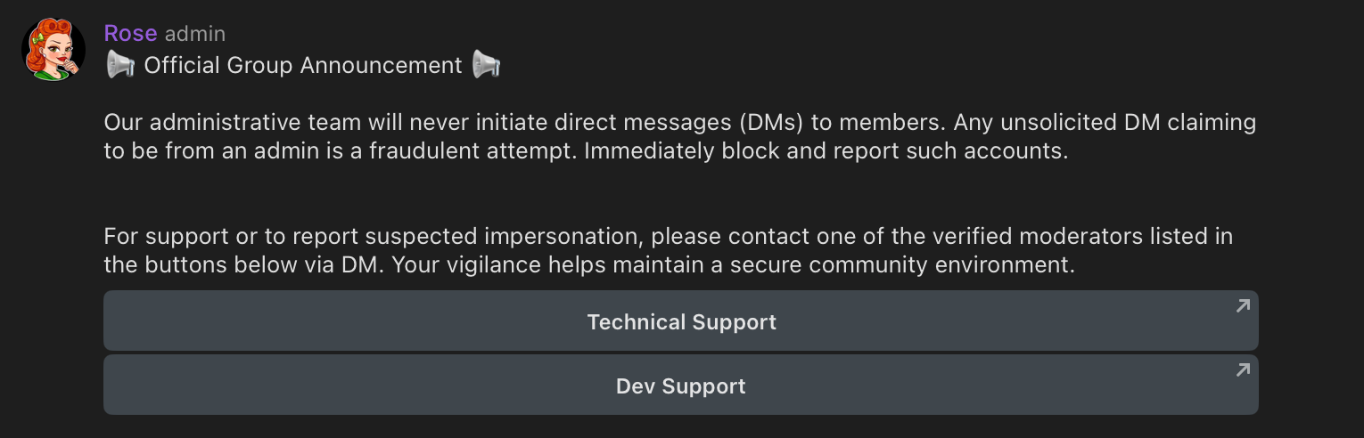 If you don't want to manage the community on Telegram or somewhere else - just turn it into a channel and put a single placeholder message there, leading users to other platforms where you do offer support. - Finally, since we're already here - anticipate the various ways scammers could impersonate as your members / resources and react.