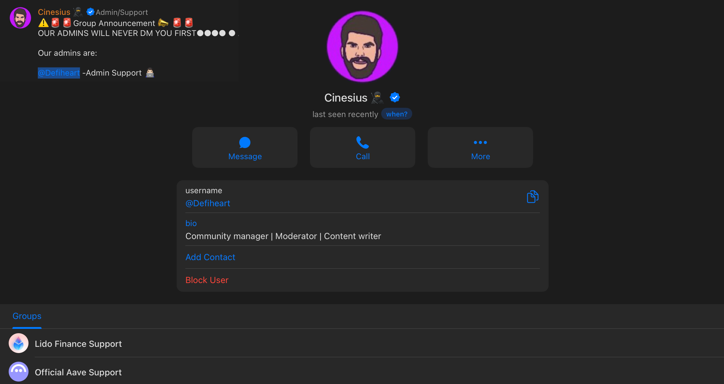 Speaking about admins - after checking approximately 7 protocols and their fake chats I started to notice the same names were popping up with some flare in different chats - like this lucky community manager who managed to land positions at both #1 and #2 protocols (by TVL).