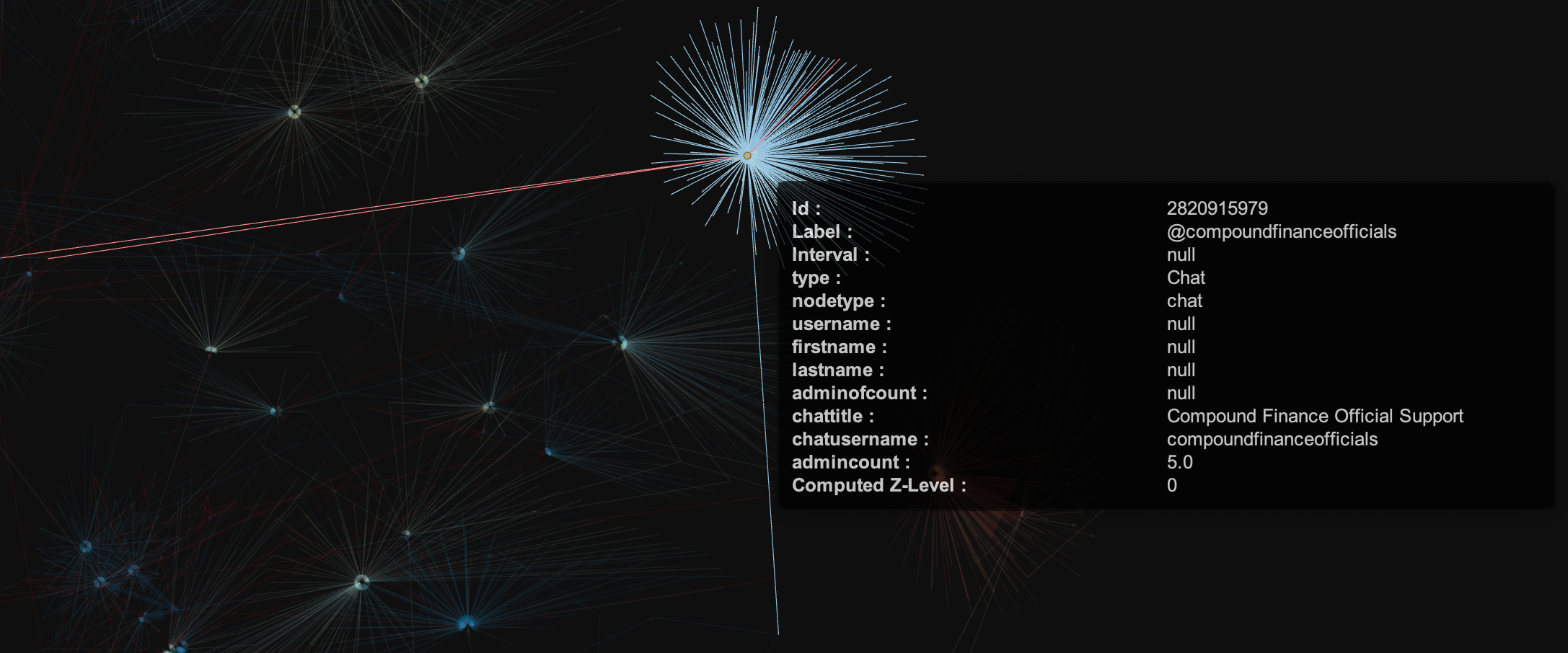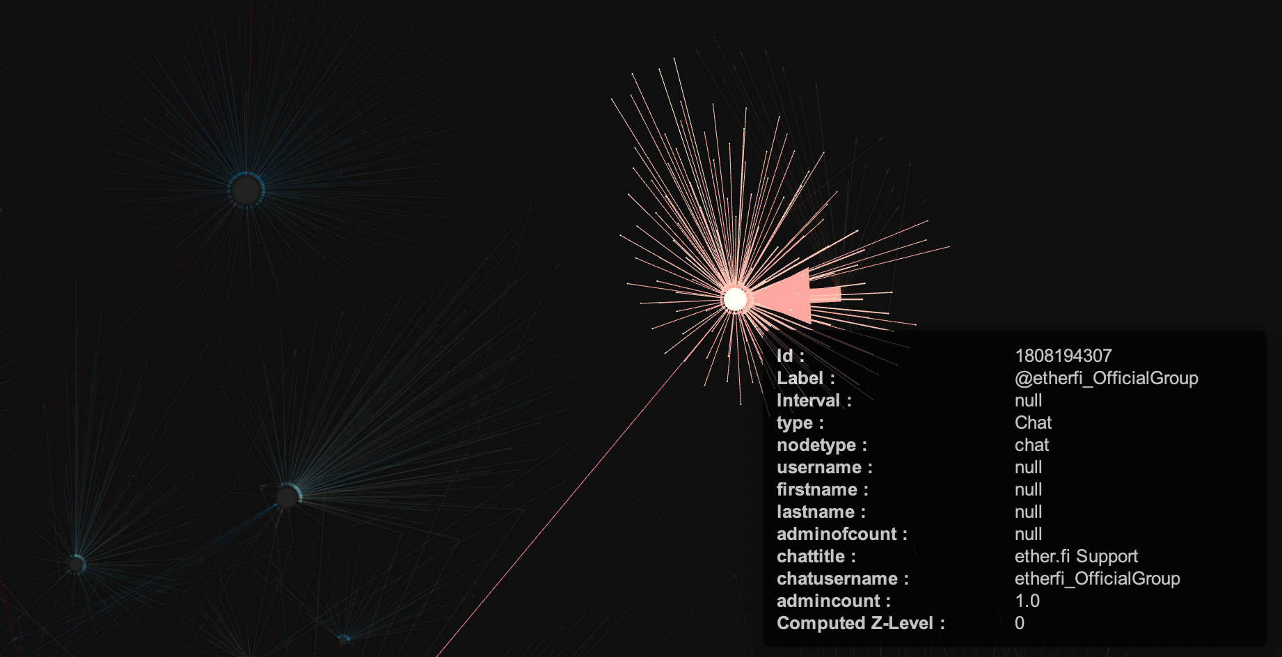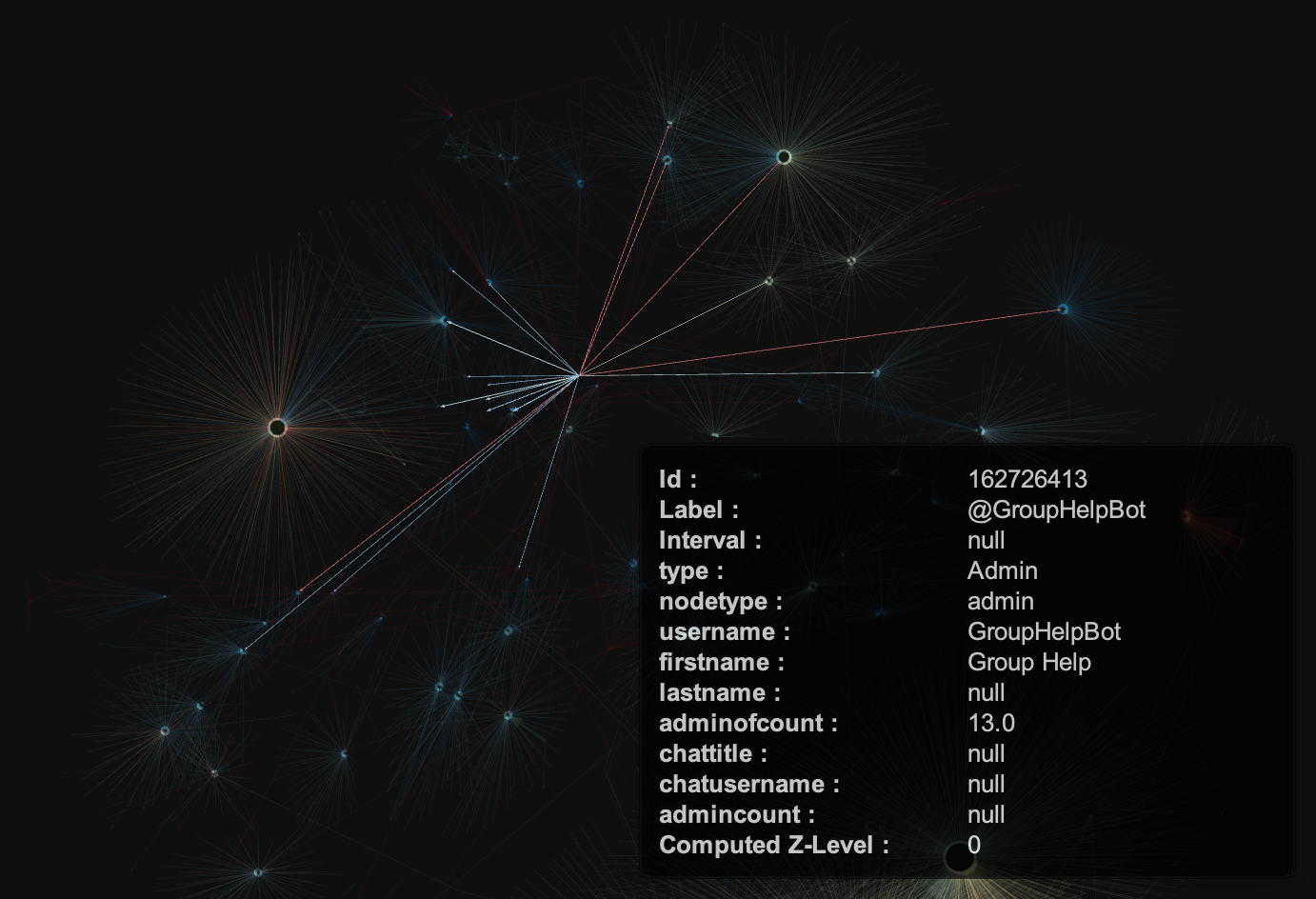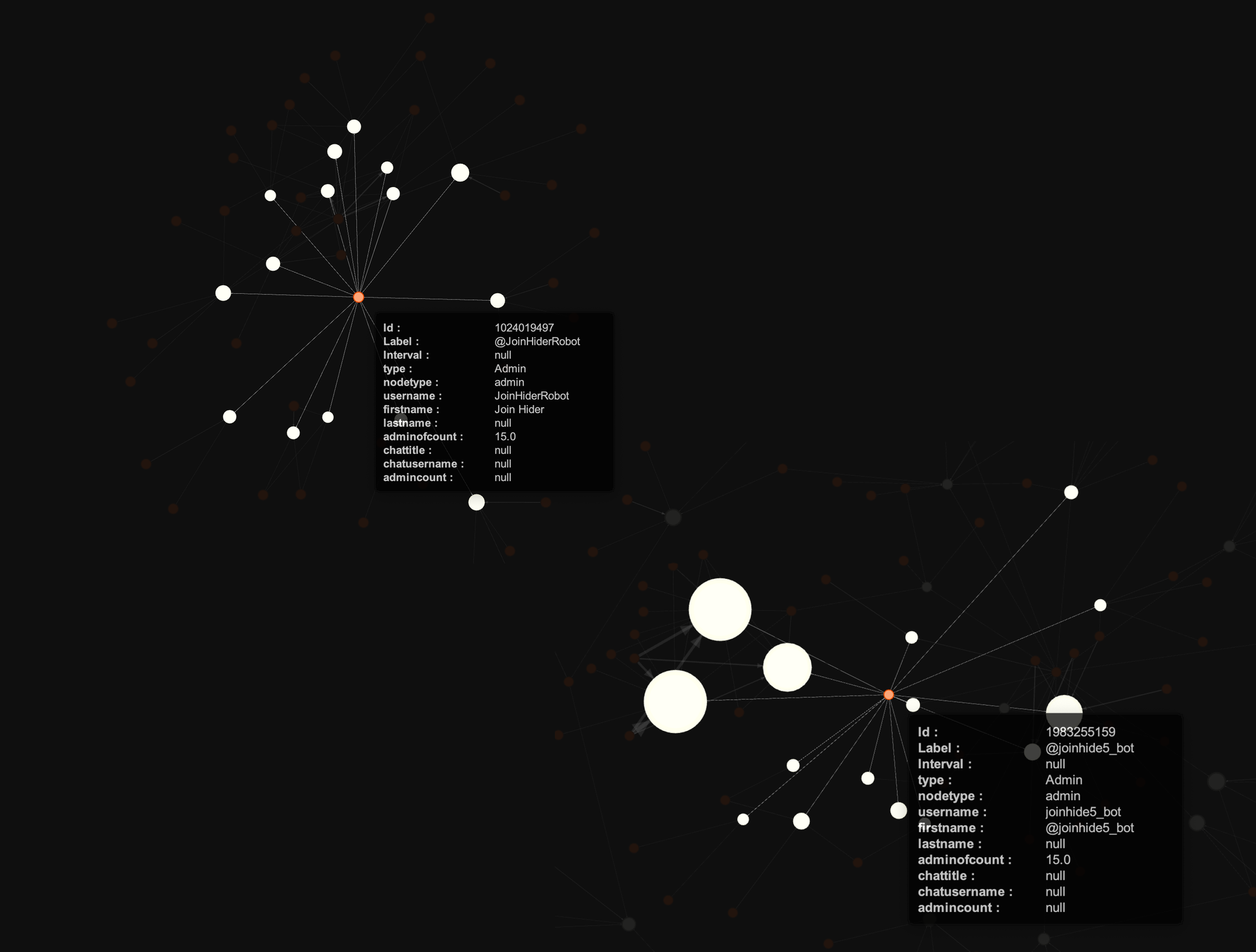 I gathered and visualised all of that data and found out all of those chats were connected to each other in multiple ways - via shared admins, users and malicious instructions.