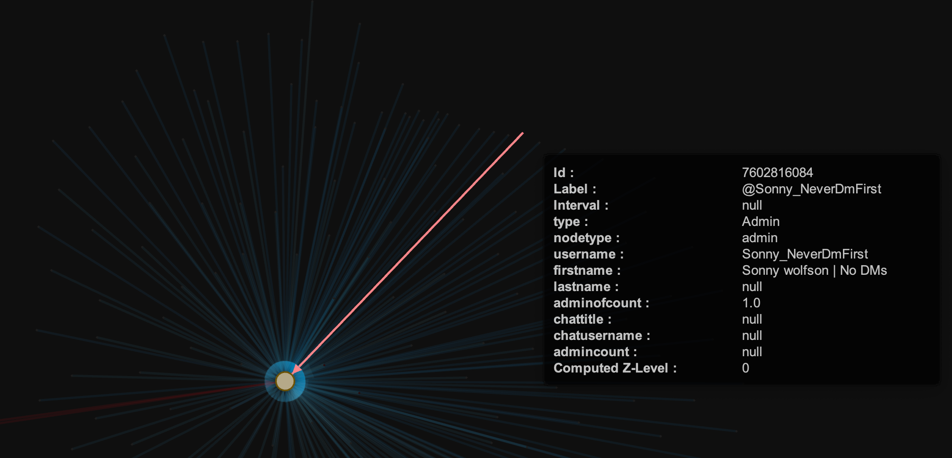 This one's only got a couple red edges - those leading to the network centre are both bots, and the one right in the cloud of users is the first chat admin - @Sonny_NeverDMFirst.
