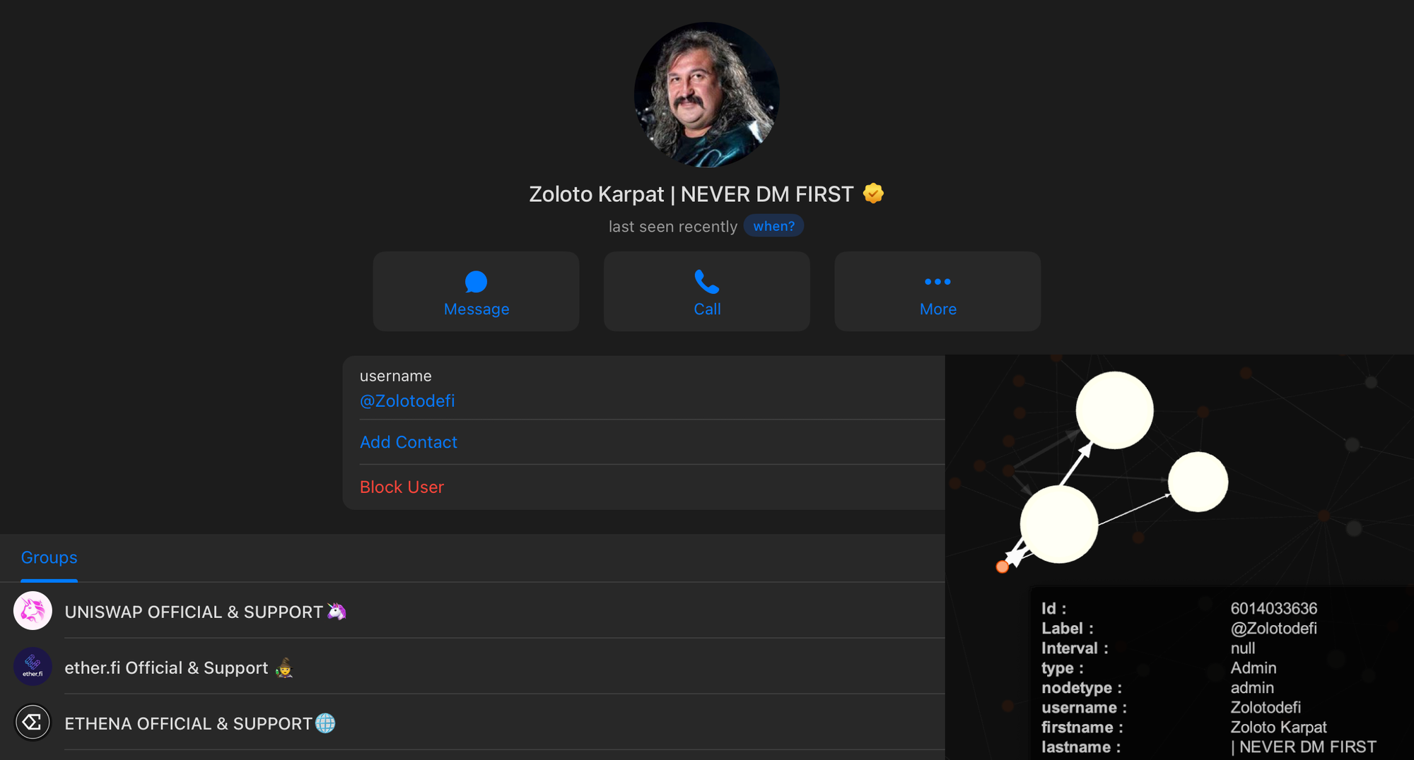 The conglomerate of 3 chats in the bottom right corner - these are, respectively, @EthenaENOfficial, @EtherfiENOfficial and @UniswapREAL (lol), - share a lot of their active (=messaging) users, probably for economy reasons: