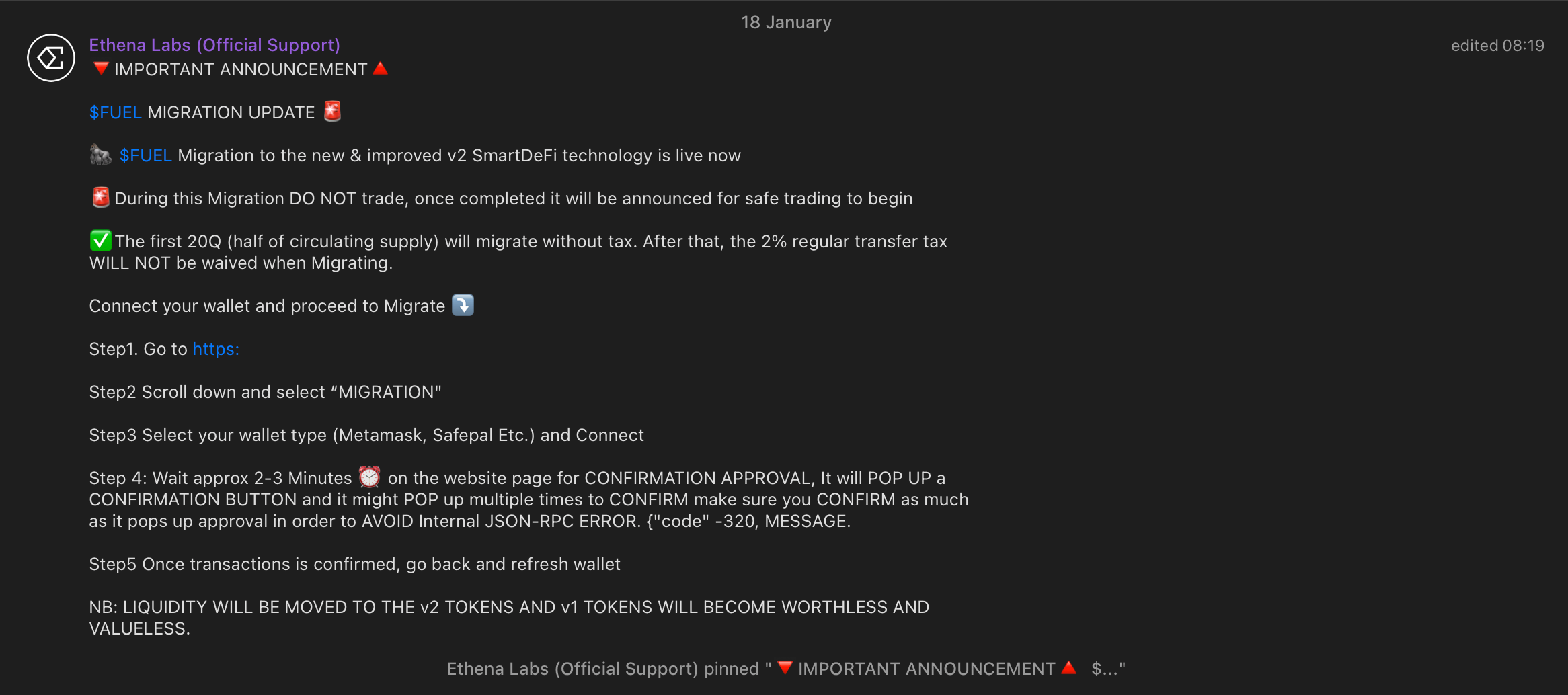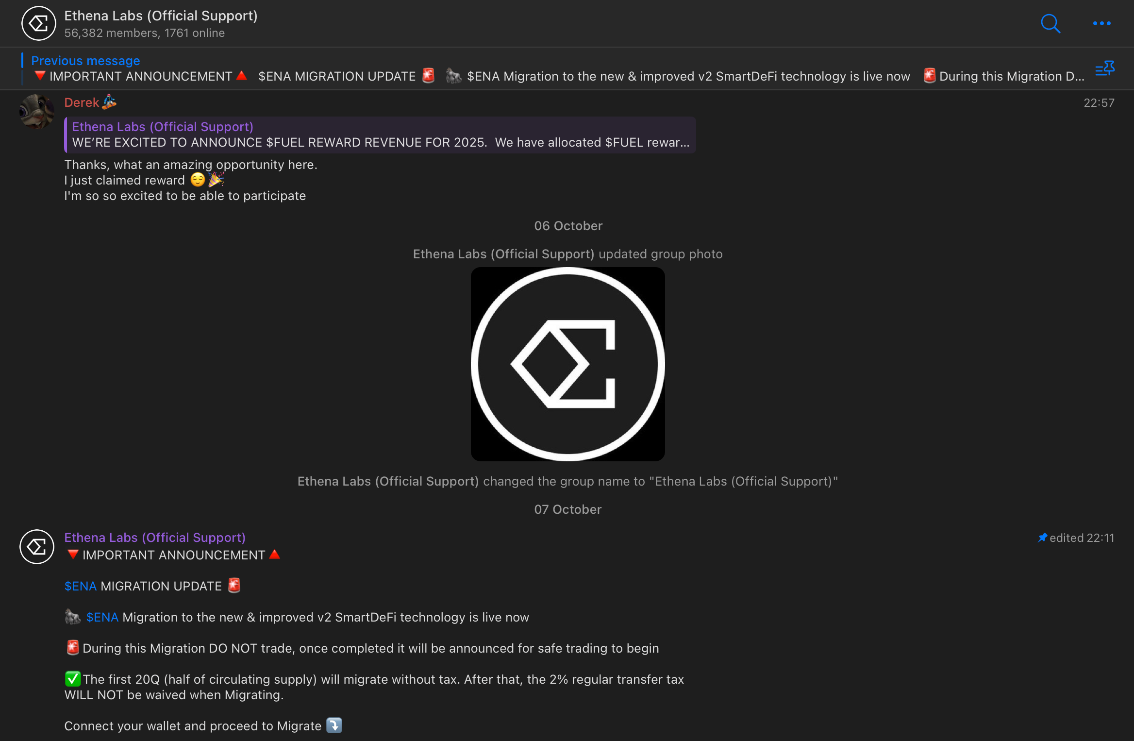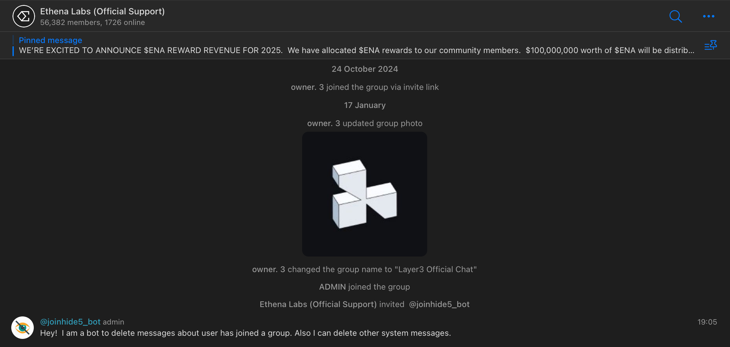 Anyway, time goes by, and in around 10 months $FUEL / Layer3 support chat magically transforms into the Ethena Labs one (the actual group rename messages seem to be deleted - what a strange and picky way of doing things...).