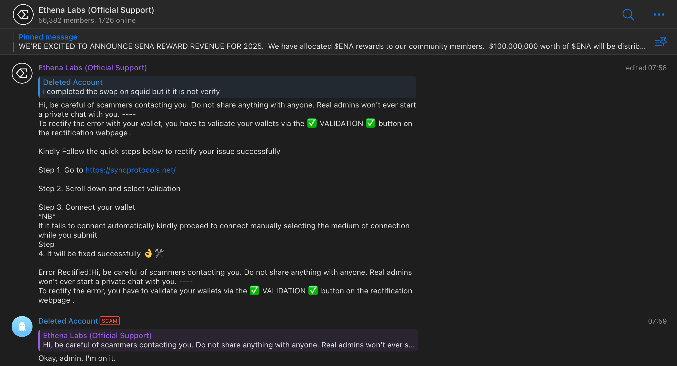 This is now a "completely new" chat that follows the same exact cycle: new bots, new fake users asking the same questions, and new announcements leading to new (or sometimes even same) phishing urls.