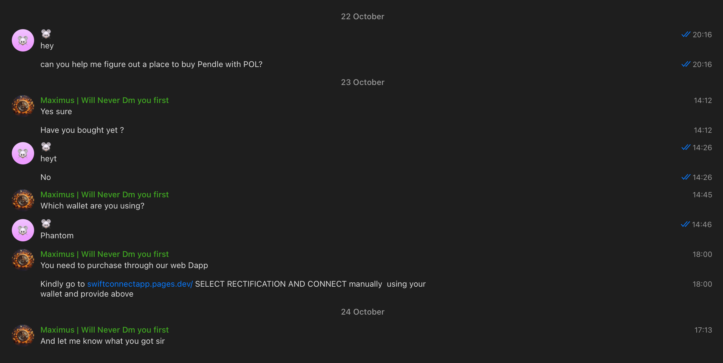 Another technique that some of the chats rely on is hiding the phishing url behind a set of redirects, like bit.ly → google form or typeform → after you submit some simple form, you get the actual phishing link as a result.