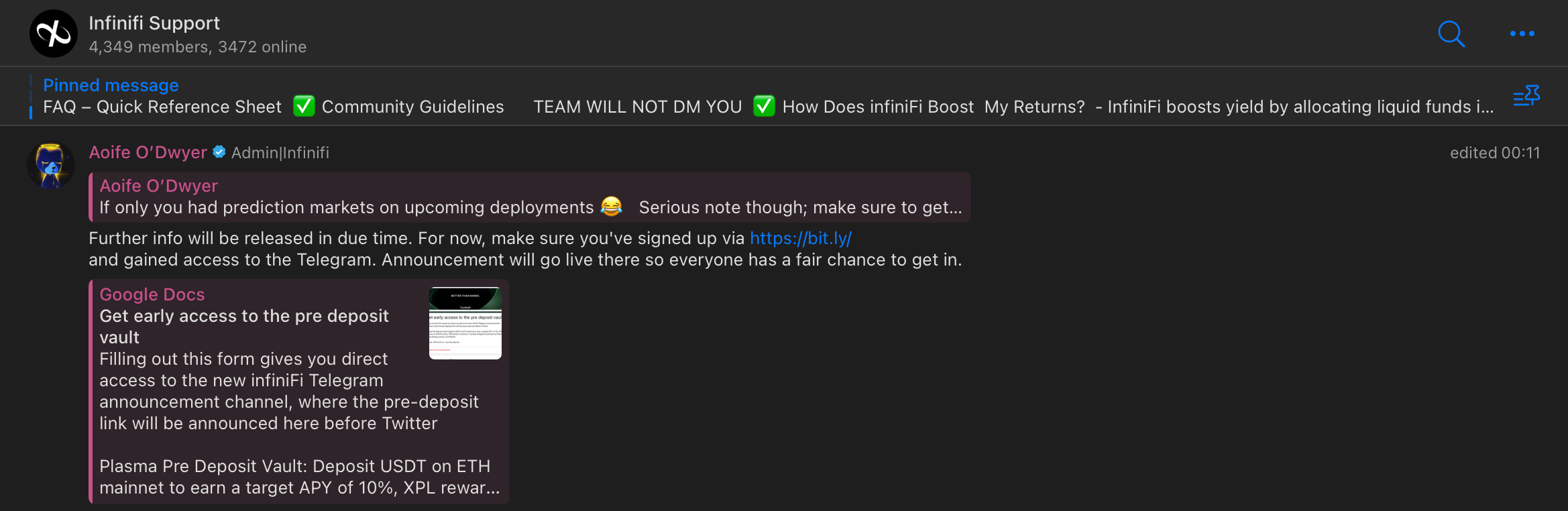 You got it right - none of them! Infinifi, which's got around $150m TVL at the time of writing this, does not list any official Telegram link on their website, nor on discord or X.