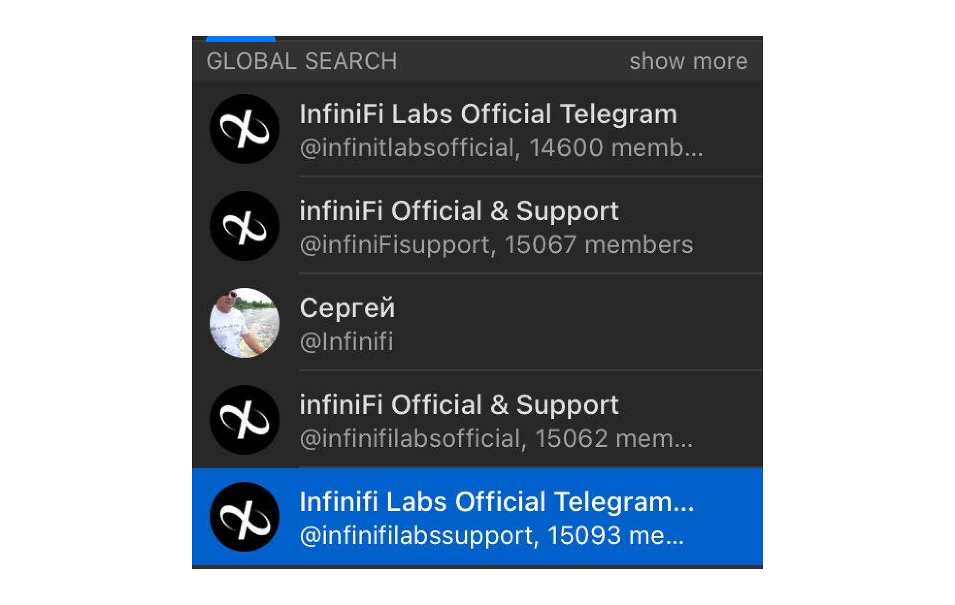 All right, this one is trickier. Apart from Сергей who probably has 0 clue how valuable his handle is, all of the chats look kinda same - +- same amount of members, similar titles and usernames (apart from the @infinitlabsofficial).